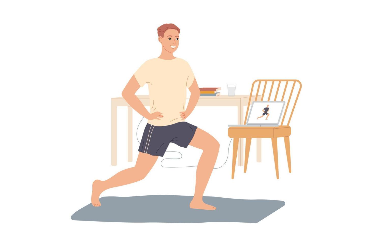 Man trains at home, does exercises from video tutorials. Pro Vector