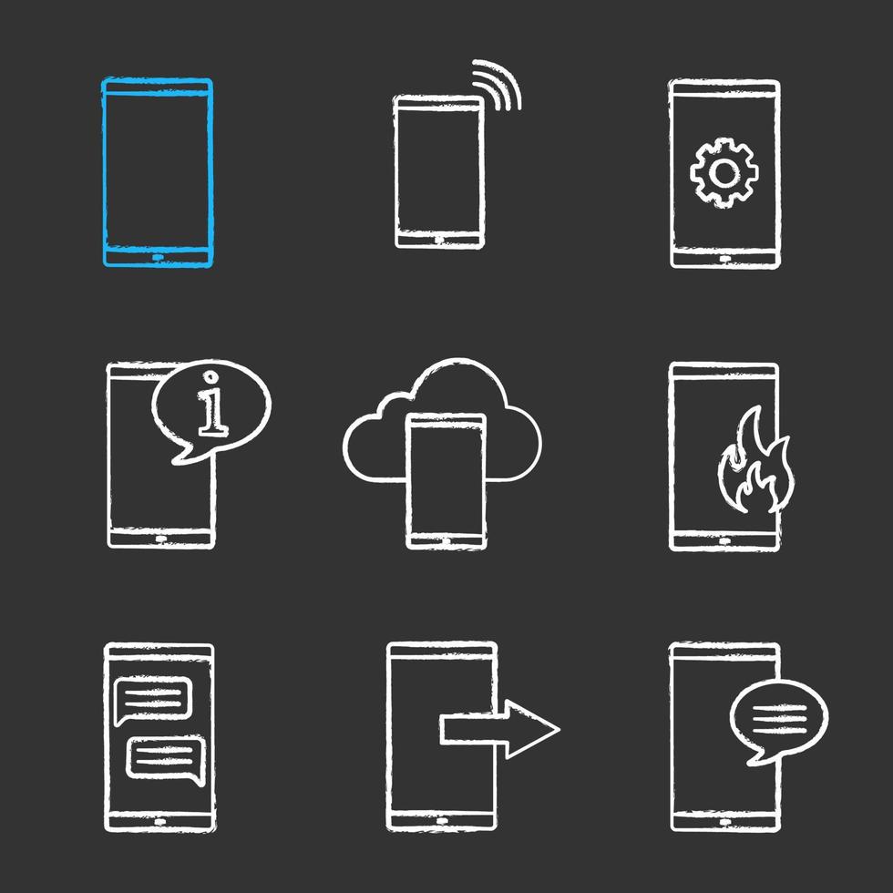 Phone communication chalk icons set. Smartphone, incoming call, settings, info chat, cloud storage, emergency, sms, data transfer, message. Isolated vector chalkboard illustrations Pro Vector
