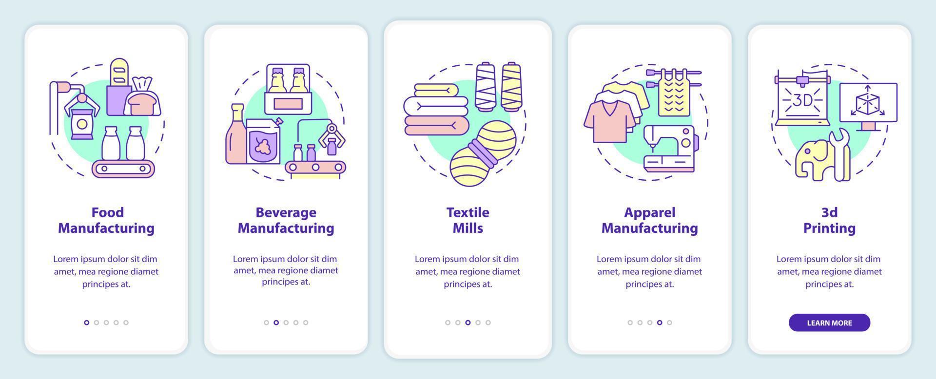 Manufacturing sub sectors onboarding mobile app screen. Walkthrough 5 steps graphic instructions pages with linear concepts. UI, UX, GUI template. Pro Vector