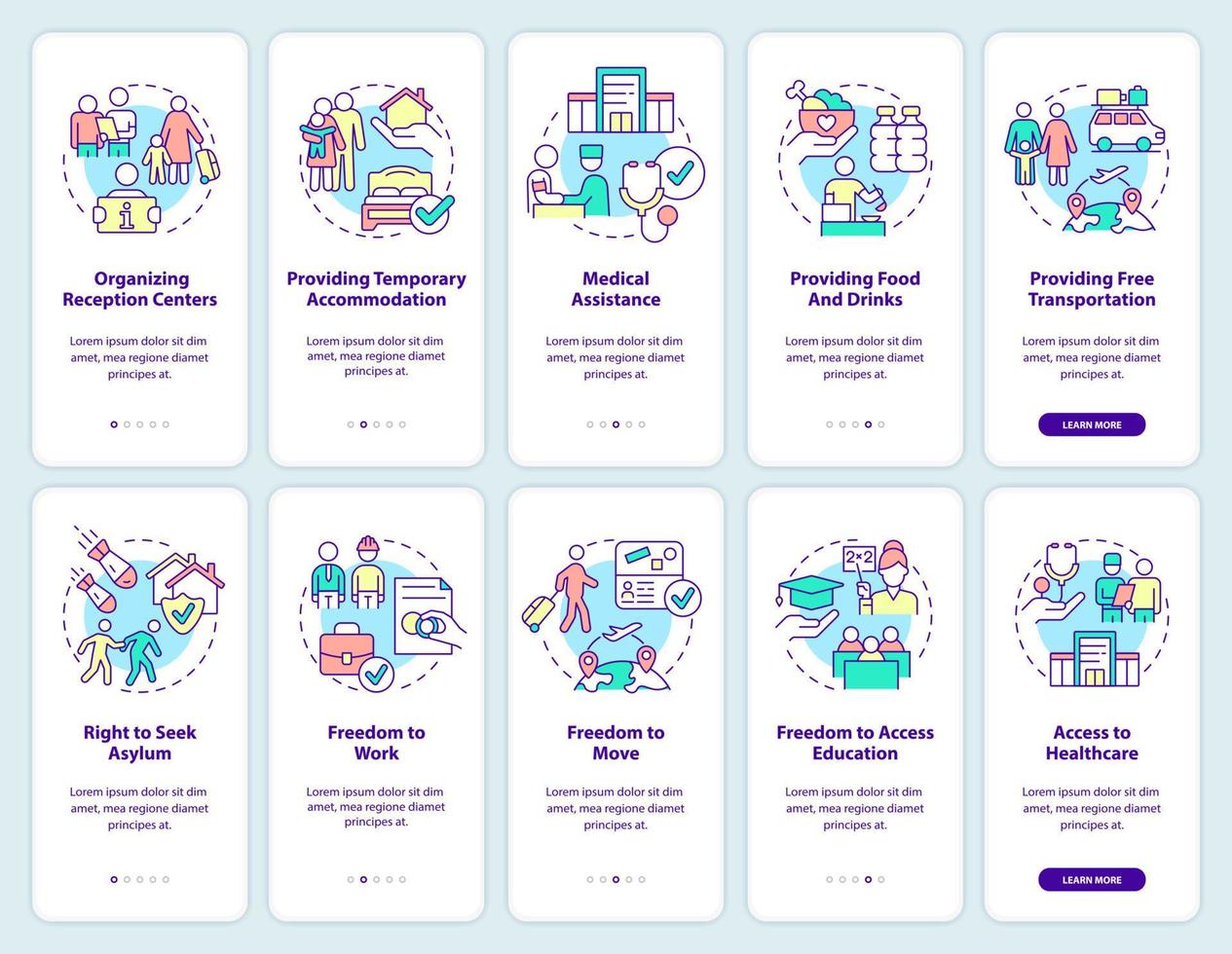 Helping refugees onboarding mobile app screen set. Governmental support walkthrough 5 steps graphic instructions pages with linear concepts. UI, UX, GUI template. Pro Vector