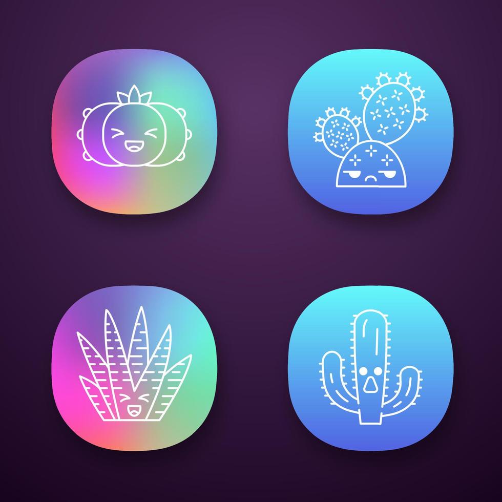 Cactuses app icons set. Plants with smiling faces. Laughing peyote and zebra cactuses. Unamused prickly pear wild cacti. UI UX user interface. Web or mobile applications. Vector isolated illustrations Pro Vector