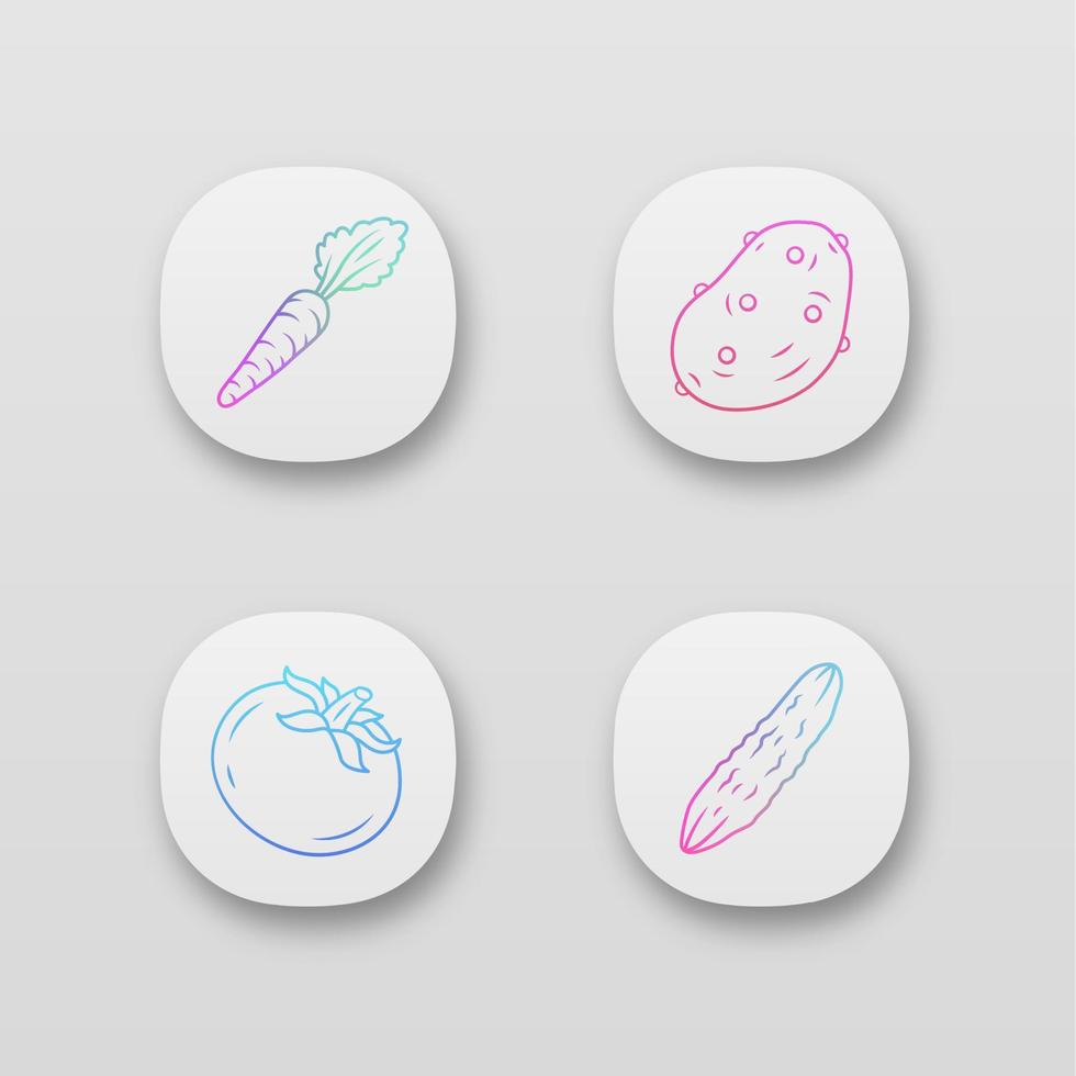Vegetables app icons set. Potato, cucumber, tomato, carrot. Vitamin and diet. Healthy nutrition. UIUX user interface. Web or mobile applications. Vector isolated illustrations Pro Vector