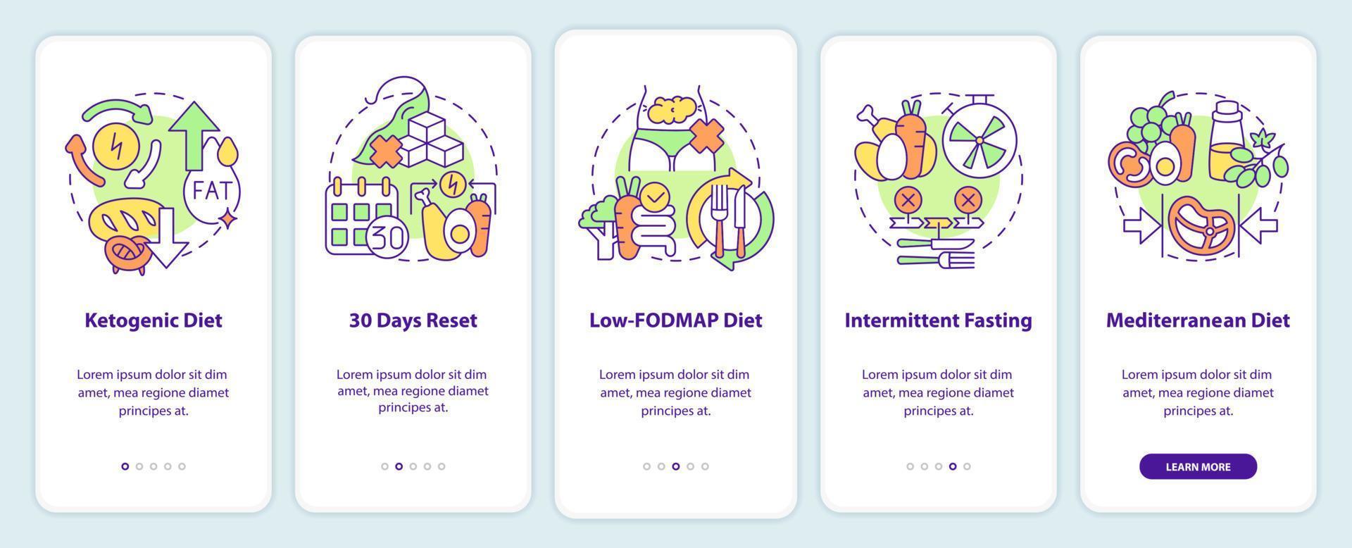 Trendy diets onboarding mobile app screen. Healthy nutrition walkthrough 5 steps graphic instructions pages with linear concepts. UI, UX, GUI template. Pro Vector