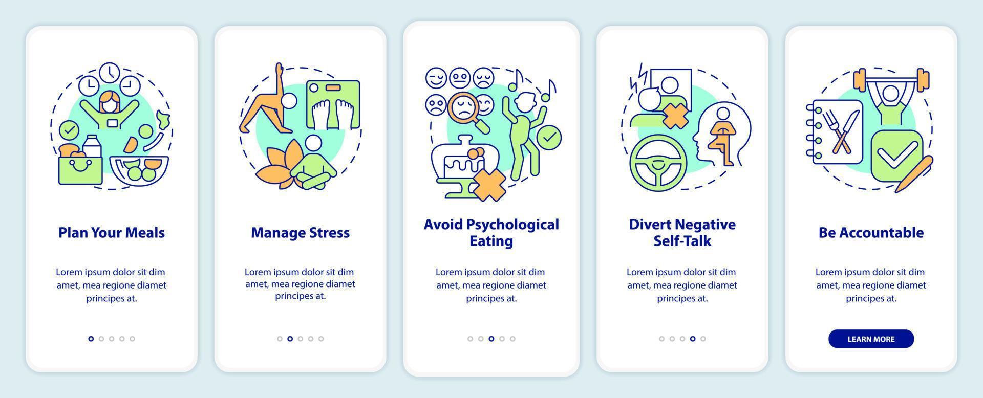 Maintaining weight after diet onboarding mobile app screen. Walkthrough 5 steps graphic instructions pages with linear concepts. UI, UX, GUI template. Pro Vector