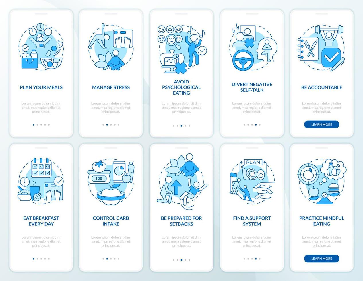 Diet trends blue onboarding mobile app screen set. Healthy nutrition walkthrough 5 steps graphic instructions pages with linear concepts. UI, UX, GUI template. Pro Vector