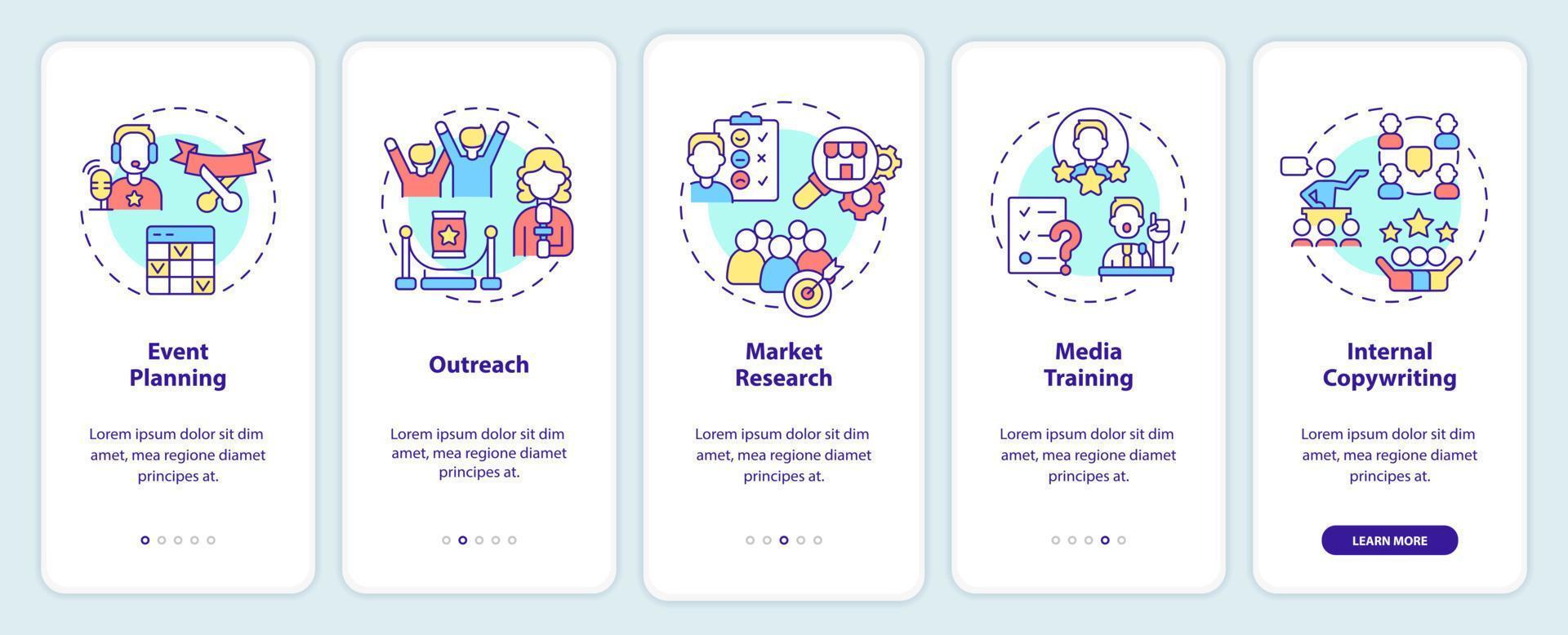 PR services for organizations onboarding mobile app screen. Relations walkthrough 5 steps graphic instructions pages with linear concepts. UI, UX, GUI template. Pro Vector