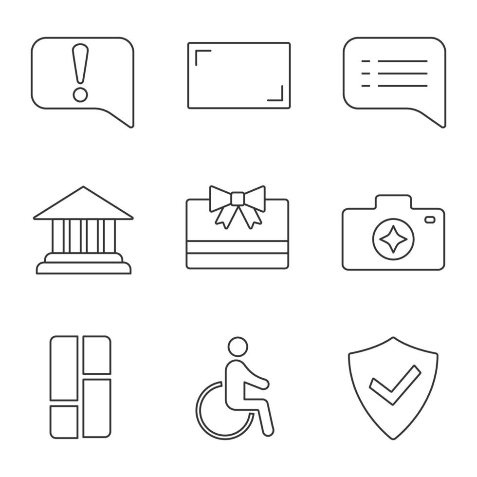UI UX linear icons set. Announcement, aspect ratio, chat, account balance, gift card, camera enhance, dashboard, accessible, secured. Thin line contour symbols. Isolated vector outline illustrations Pro Vector