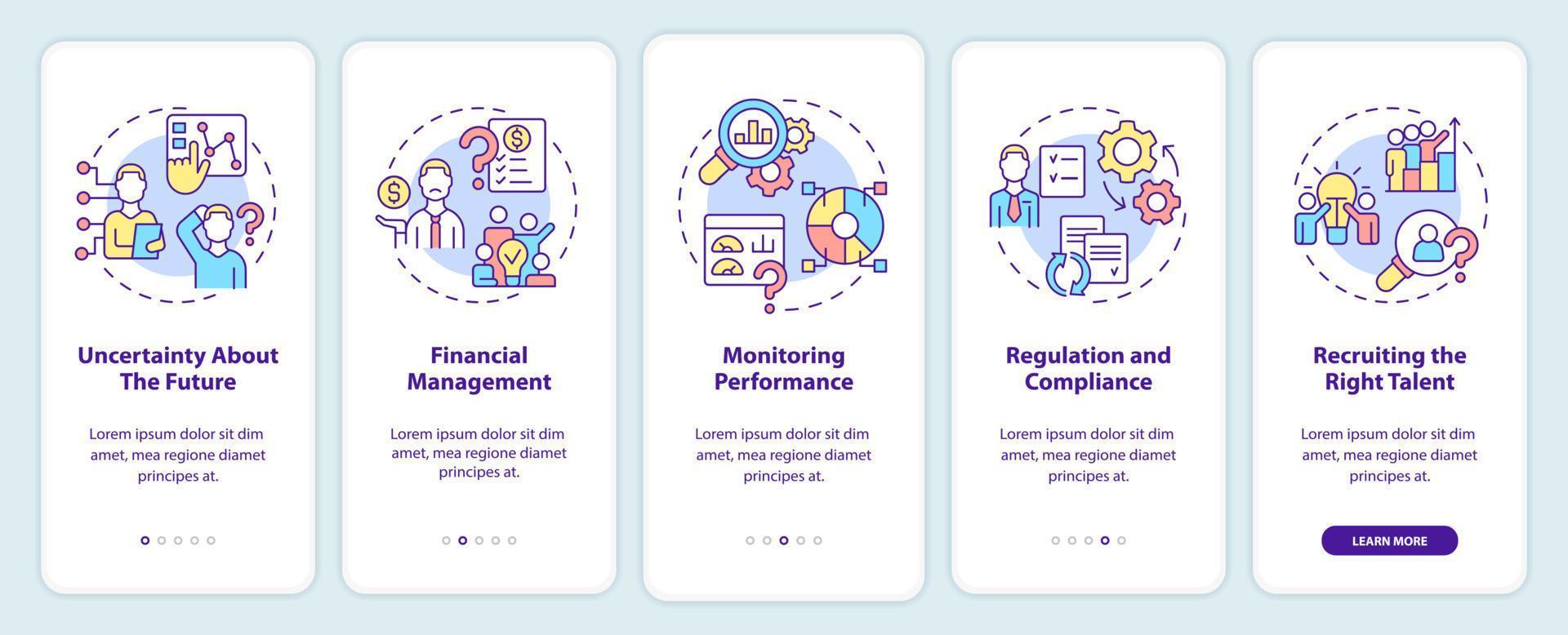 Business challenges onboarding mobile app screen. Monitoring performance walkthrough 5 steps graphic instructions pages with linear concepts. UI, UX, GUI template. Pro Vector