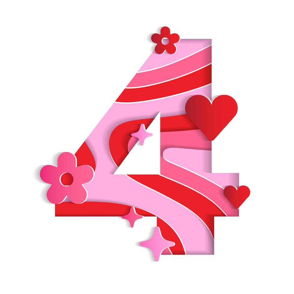4 Numeric Valentines Day Love Abstract Character Font Number Paper Lively Flower Heart Sparkle Shine Red Pink Mountain Geography Contour Map 3D Layer Paper Cutout Card Web Banner Vector Illustration