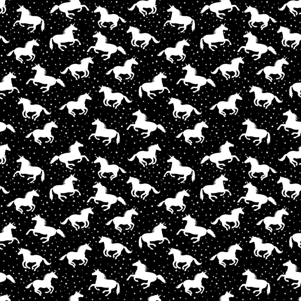 Seamless white unicorn pattern on black background with stars. Print funny for fabric, paper and web. Pro Vector