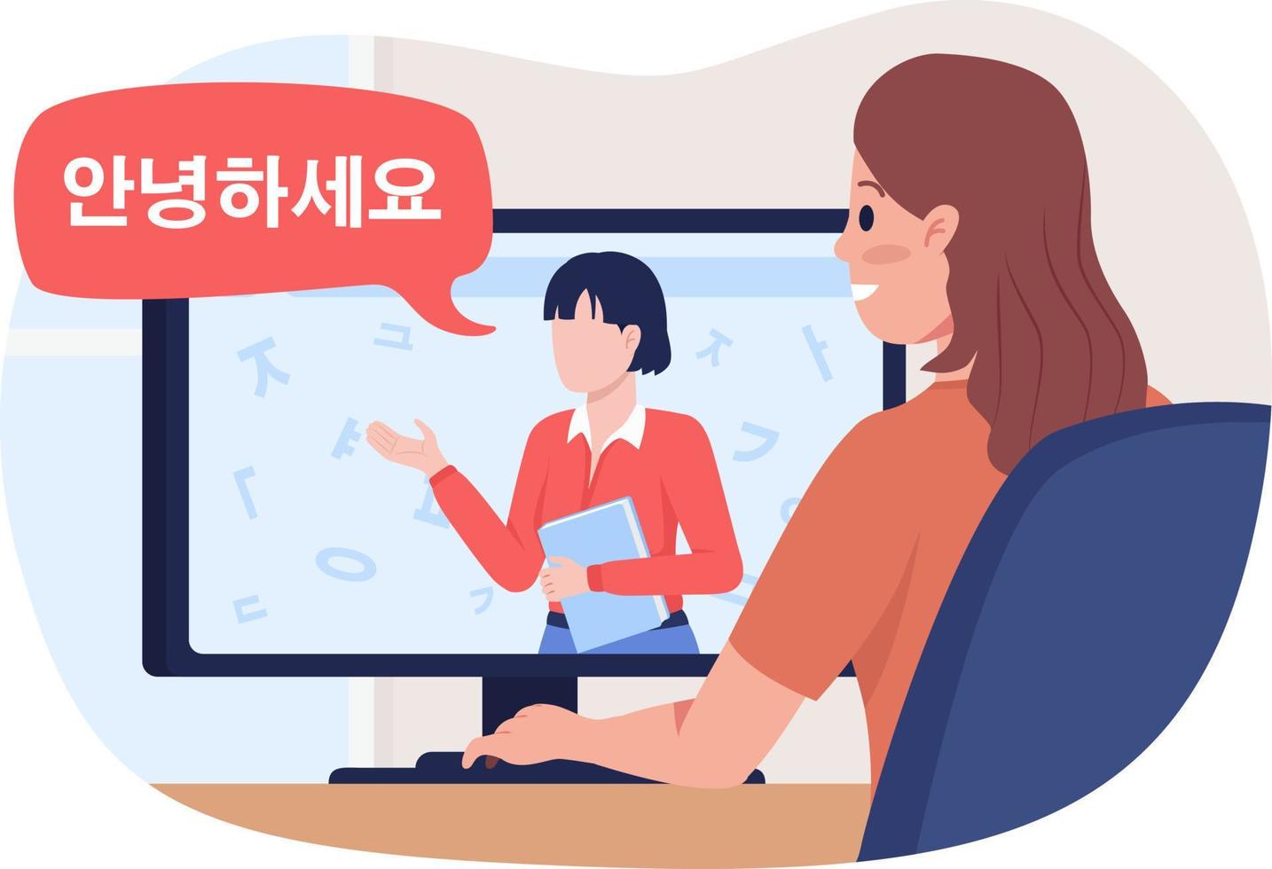 Taking Korean online course 2D vector isolated illustration. Lesson with native speaker teacher flat characters on cartoon background. Colourful editable scene for mobile, website, presentation Pro Vector