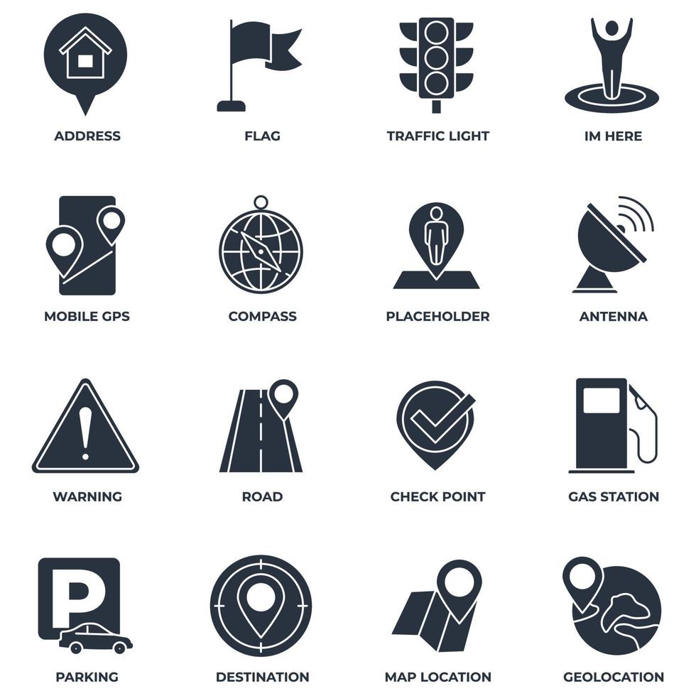Set of Navigation location icon logo vector illustration. location pack symbol template. address, flag, traffic light, warning, road and more for graphic and web design collection Pro Vector