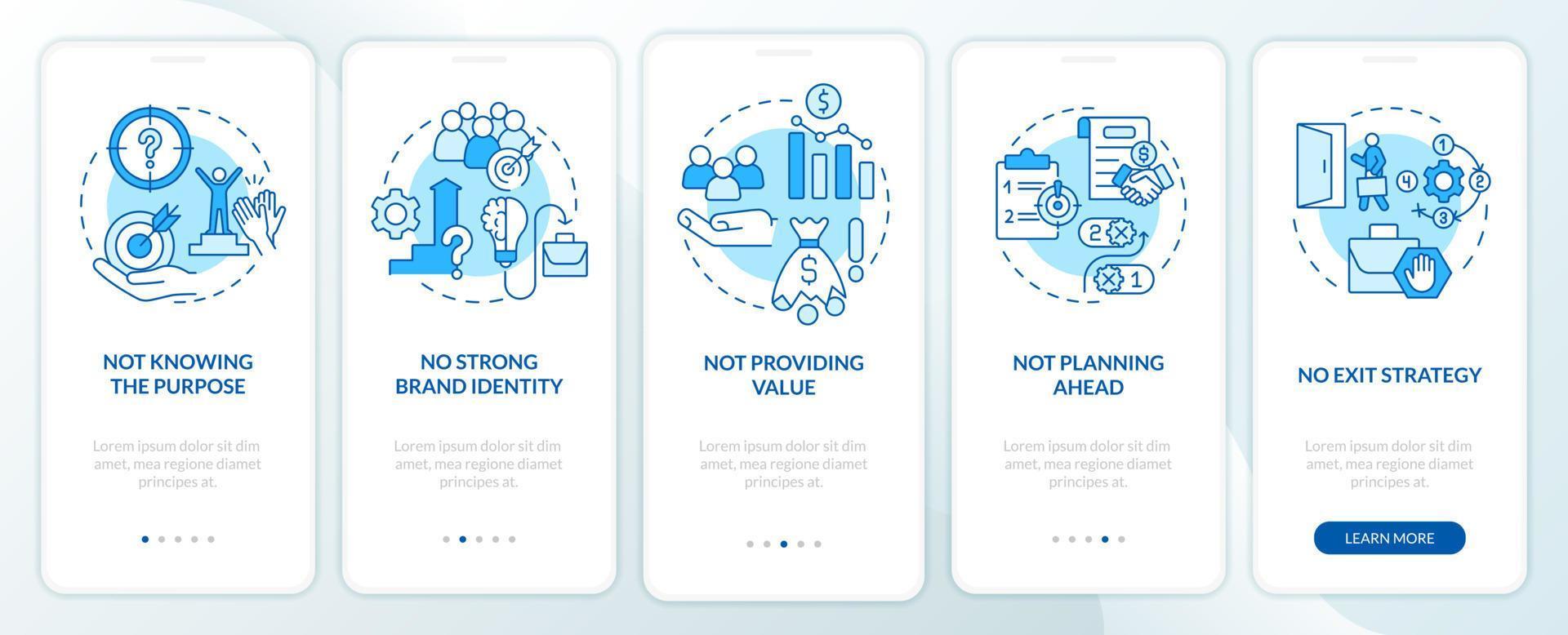 Problems faced by small business blue onboarding mobile app screen. Walkthrough 5 steps graphic instructions pages with linear concepts. UI, UX, GUI template. Pro Vector