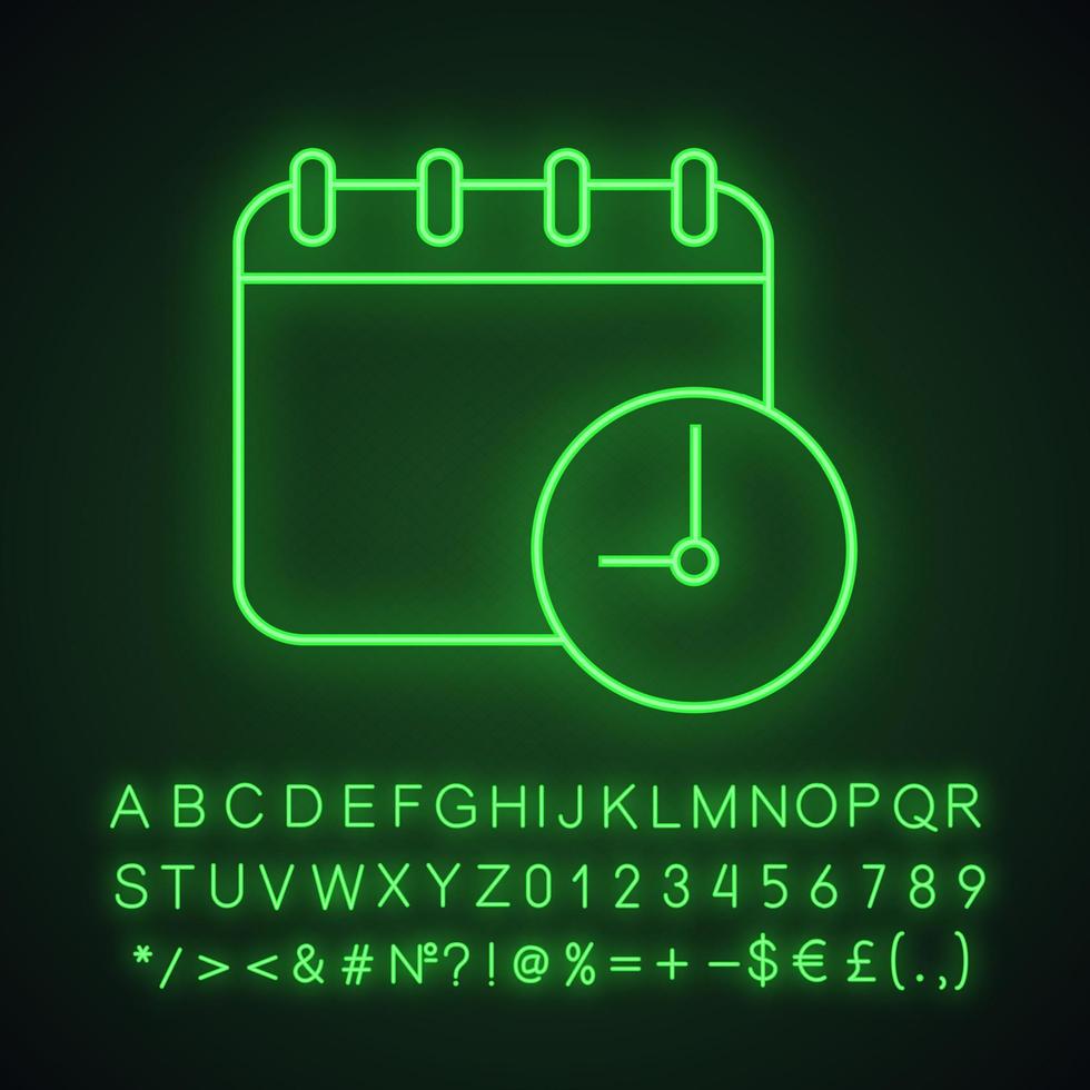 Schedule neon light icon. Appointment. Timetable. Calendar page with clock. Glowing sign with alphabet, numbers and symbols. Vector isolated illustration Pro Vector