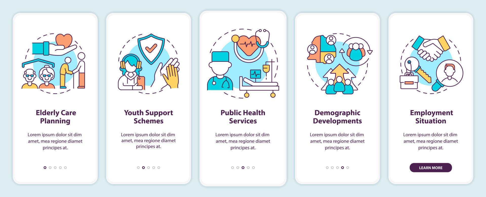 Social planning examples onboarding mobile app screen. Walkthrough 5 steps graphic instructions pages with linear concepts. UI, UX, GUI template. Pro Vector