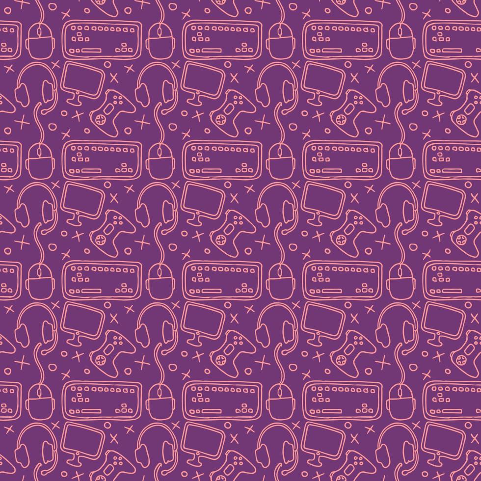 Seamless gaming pattern. Background with gamepad,monitor, keyboard, computer mouse, headphones Pro Vector