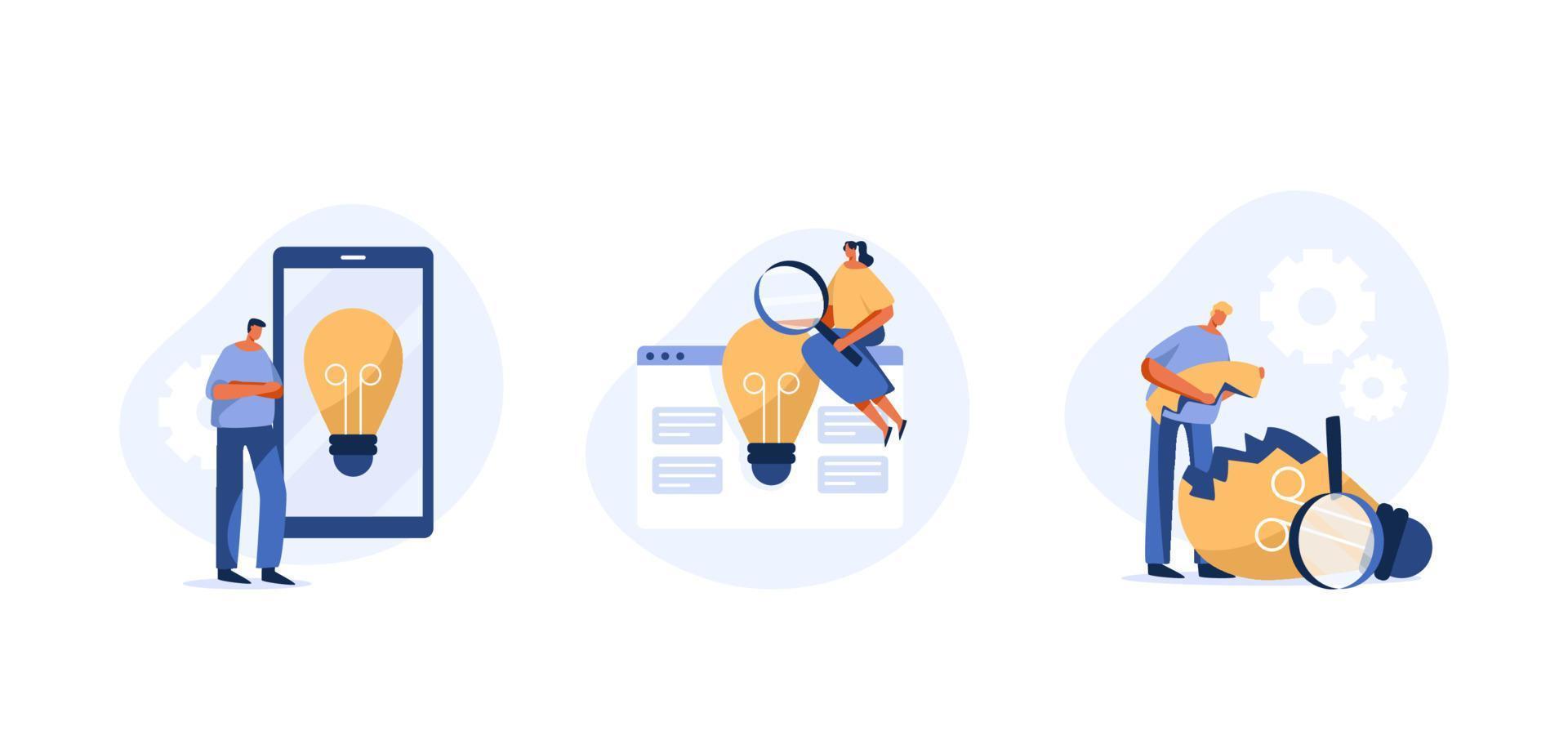 Ideas and finding inspiration. Creating new innovations for business or researching knowledge. Flat Character with Light Bulb. Pro Vector
