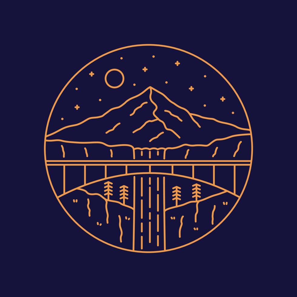A Mountain and waterfall view with bridge a cross in mono line art vector design Pro Vector and Pro SVG