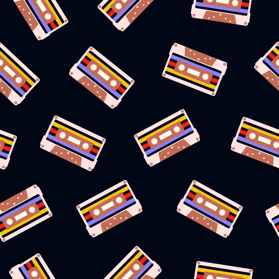 Seamless pattern with audio cassette on a dark blue background. Trendy abstract print in style retro 70s, 80s. Vector illustration Pro Vector