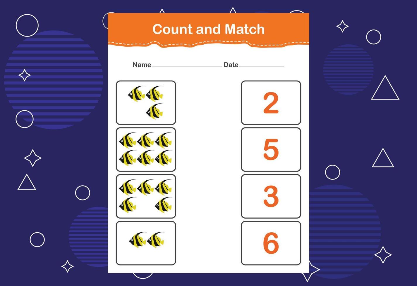 Count and match with the correct number. Matching education game. Count how many items and choose the correct number vector