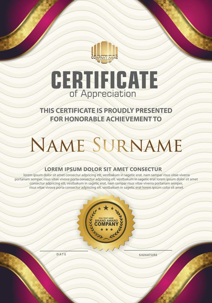 Luxury vertical modern certificate template with purple and gold flow lines effect ornament on texture pattern background, Free Vector