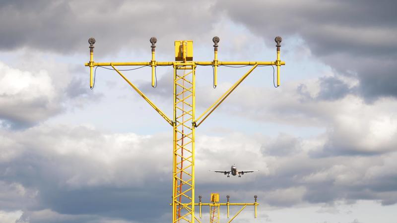 Airliner approaching the runway before landing. View from the runway front with ALS masts in the foreground Pro Video