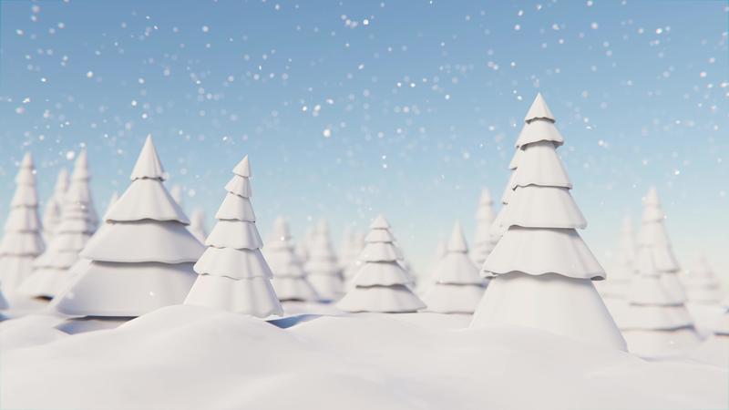 4K loop Animation. Snowflakes falling in a frozen forest with pine trees. Winter background. Pro Video