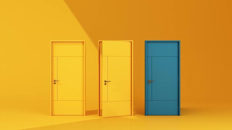 3d rendering, open door, objects isolated on bright pastel background and blue door. Abstract metaphor, options and opportunities, choice, modern minimal concept. animation looped animation looped Pro Video