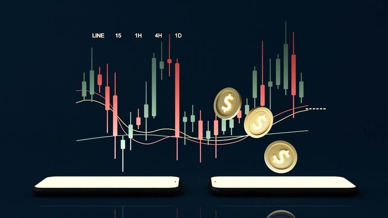 digital currency gold coin on display sticks with hidden lights illuminated on a digital background Black background with glow from the ground and stock chart in the back. 3d render animation looped Pro Video