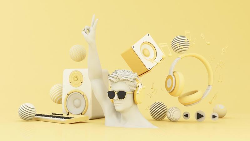Electric piano keyboard surrounded by speakers, headphones, smart phone with song play list and music key note isolated on pastel background. 3d rendering animation loop Pro Video
