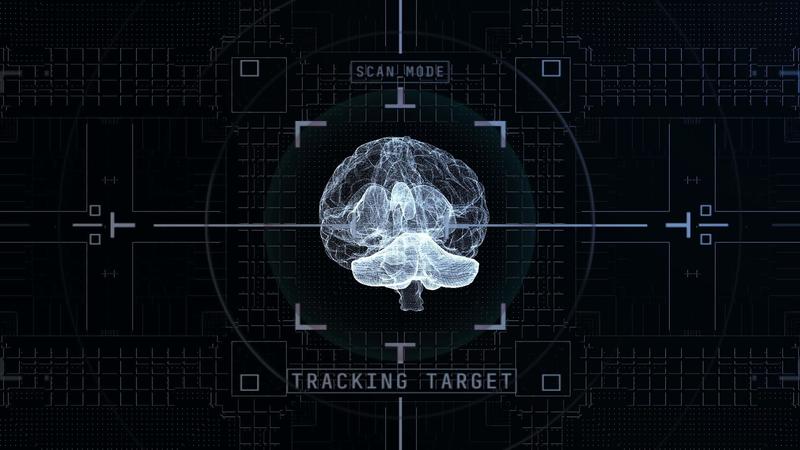 Seamless looping brain MRI scanner tomography x-ray particle with user interface HUD display and target scanning element background. Technology and medical science concept. Pro Video