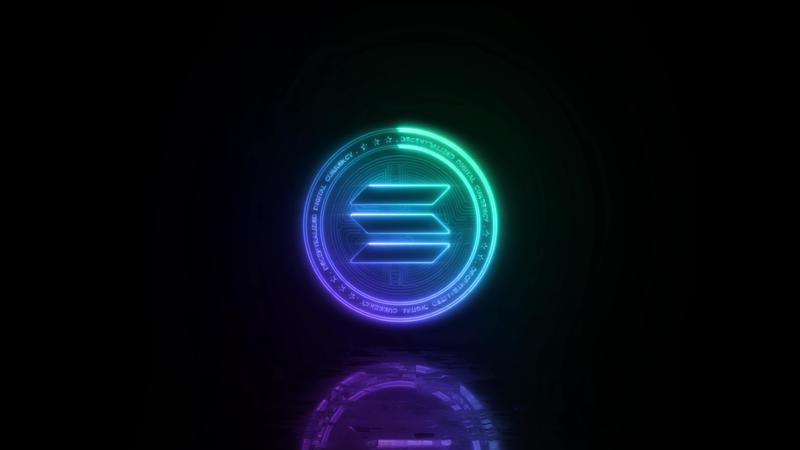 Neon glowing solana symbol cryptocurrency. Intro animation with reflections on the black ground and circuit connections representing the blockchain. Concept of digital payments and electronic money.