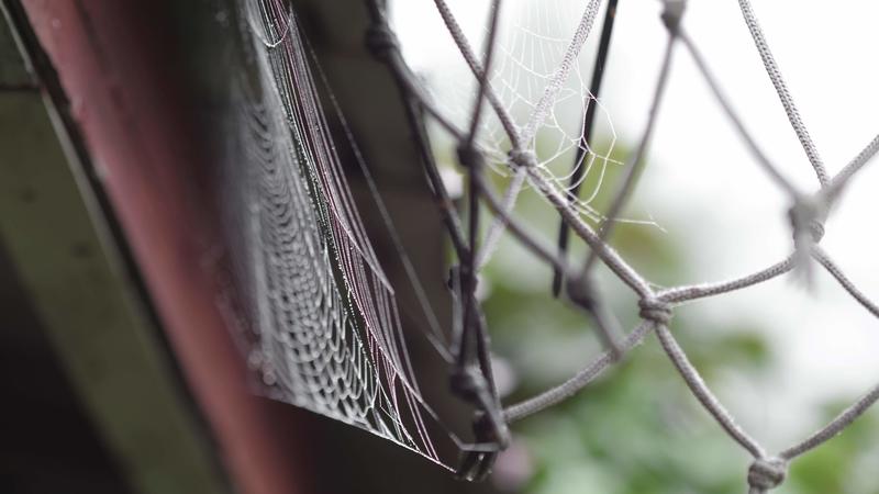 Close up view of spider web covered with drops of moist . Basketball net. Pro Video