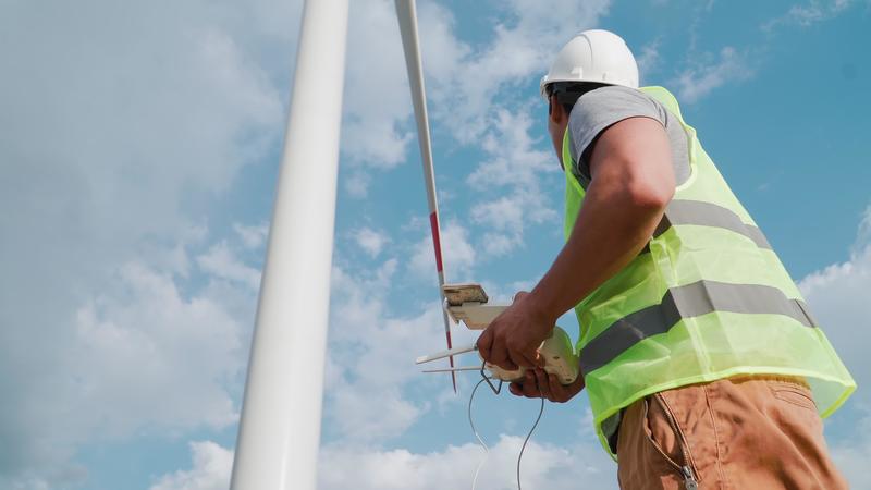 Man Professional Ecology Engineer in uniform and helmet holding remote controller for flying drone working on background of windmills. Wind farm service. Alternative to electrical energy. Free Video