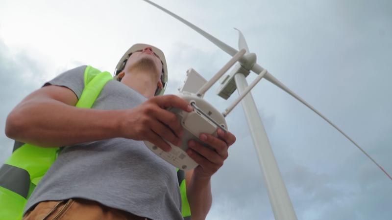 Man Professional Ecology Engineer in uniform and helmet holding remote controller for flying drone working on background of windmills. Wind farm service. Alternative to electrical energy. Free Video