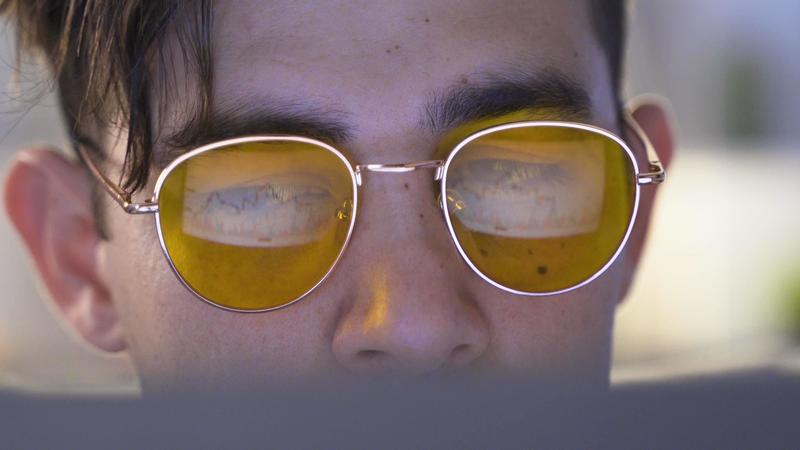 The man is checking the market data. Bitcoin and ethereum blockchain trading concept. Man Using Computer with Screen Displaying Real Time Stocks, Currency Market Charts. Pro Video