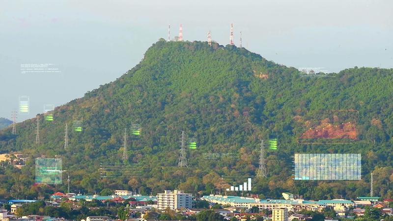 high power electric pole with battery graph bar animation on mountain, concept smart city saving power and display data show electricity consumption in evening Free Video