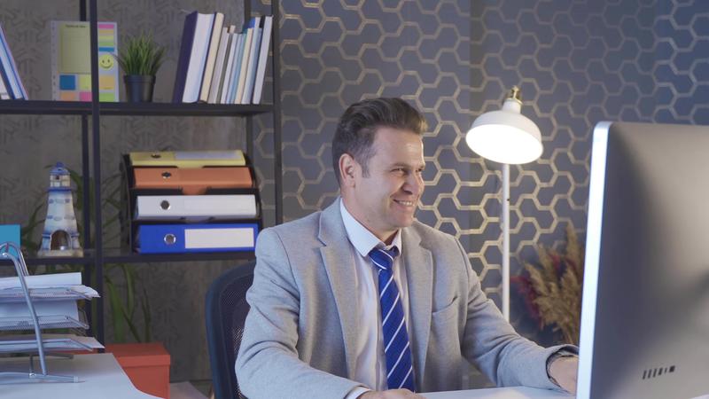 Office worker rejoicing and clapping. Office worker looking at computer at work rejoices and congratulates. Pro Video