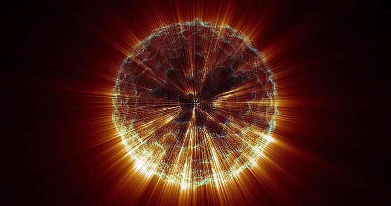 Abstract animation motion design with an unusual beautiful bright glowing explosion of a star of a ball of a sphere of small particles with rays in space background in high resolution 4k Free Video