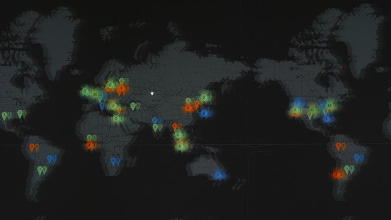 World map with different targets for cyber attack. Hacking and technology concept. Macro shooting at monitor pixels Pro Video