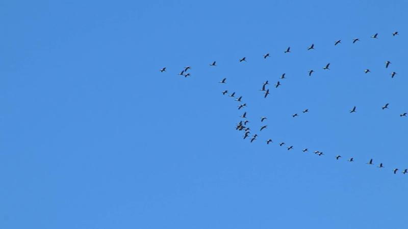 Flock of cranes flying in formation to save energy with blue sky background leave to their wintering grounds as regular migration in autumn and spring in south direction and warm regions to survive Pro Video