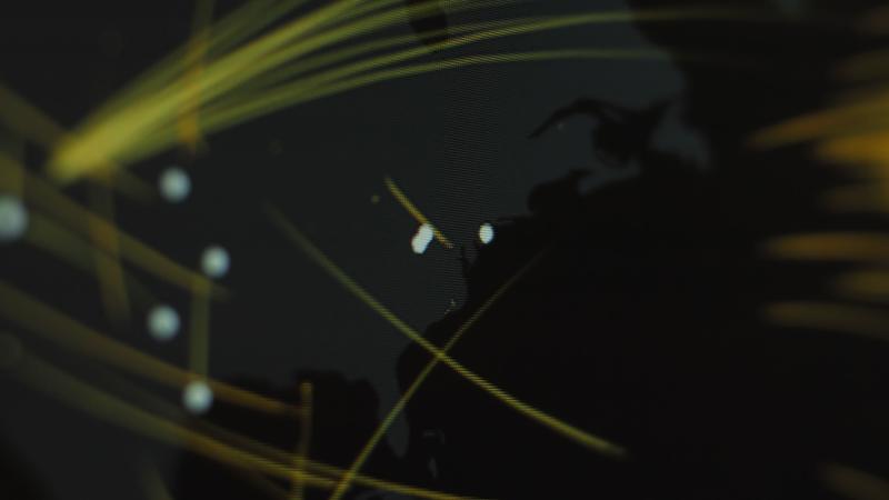 World map with different targets for cyber attack. Hacking and technology concept. Macro shooting at monitor pixels