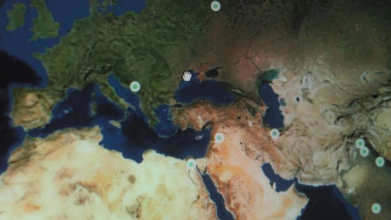 World map with different targets for cyber attack. Hacking and technology concept. Macro shooting at monitor pixels