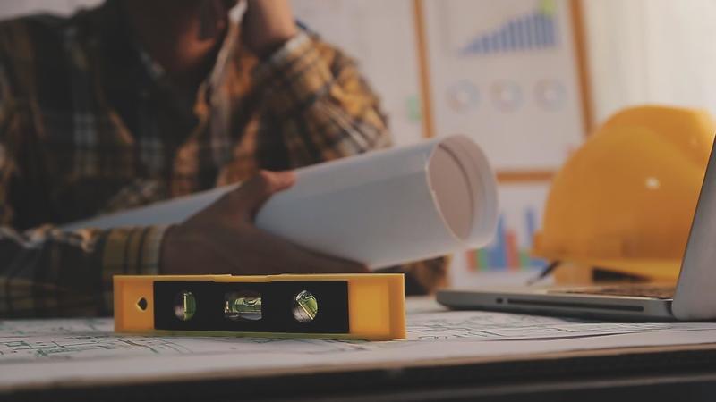Two colleagues discussing data working and tablet, laptop with on on architectural project at construction site at desk in office Pro Video