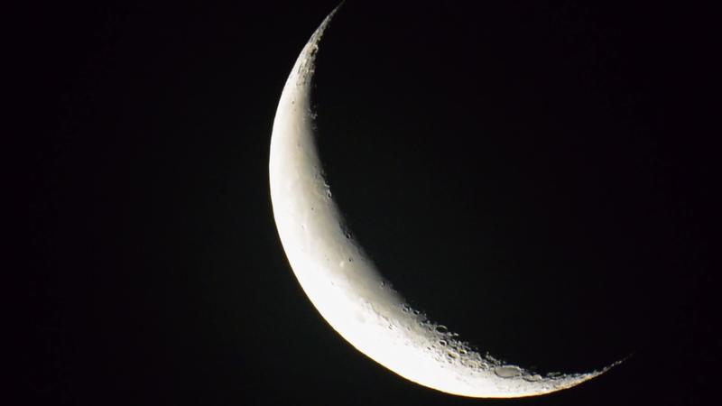 Static view close up earths satellite moon full in frame move left to right in dark sky. Wanning crescent phase. Cosmos from telescope view Pro Video