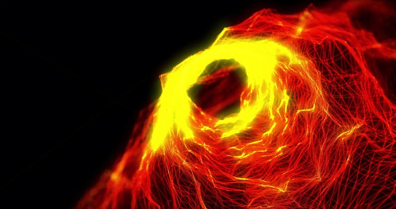 Abstract background with orange fiery waves and lines from triangles and points of energy magical light. Screensaver beautiful video animation in high resolution 4k Pro Video