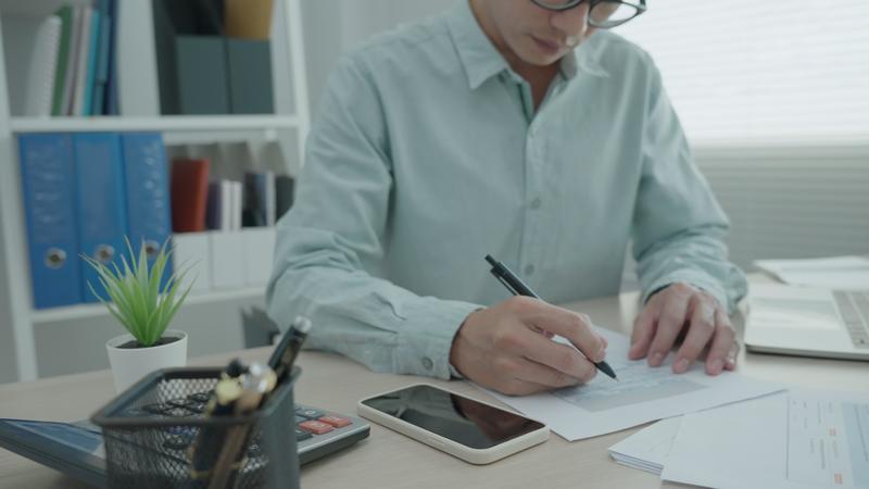 Office man using a mobile phone scan barcode and QR code for pay invoice monthly. The business man scan bill online for comfortable and fast for manage. Concept online payment. Pro Video