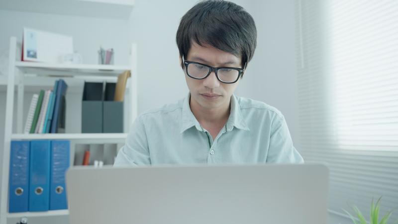 Business owners are stressed because of company problems. A company employee is taking off his glasses and sits at the computer because he has pain from using the computer for a long time. Pro Video