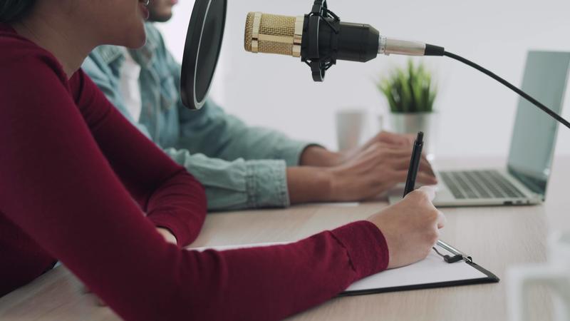 woman and man speaking on a morning radio station broadcasting a news program and men preparing the content via computers. The woman is testing the microphone by speaking test. concept radio program. Free Video