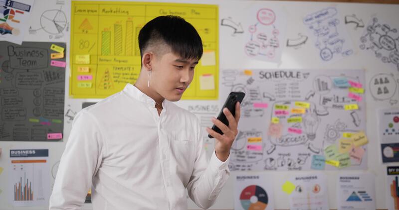 Portrait of attractive businessman texting message on smartphone at workplace. Smiling man using cellphone at office room. Cheerful man smiling and looking at camera. Pro Video